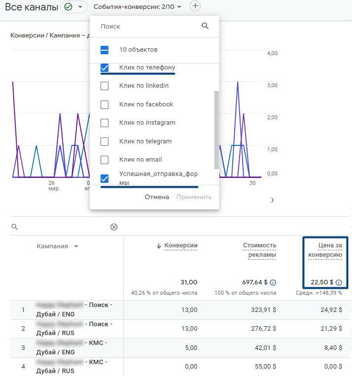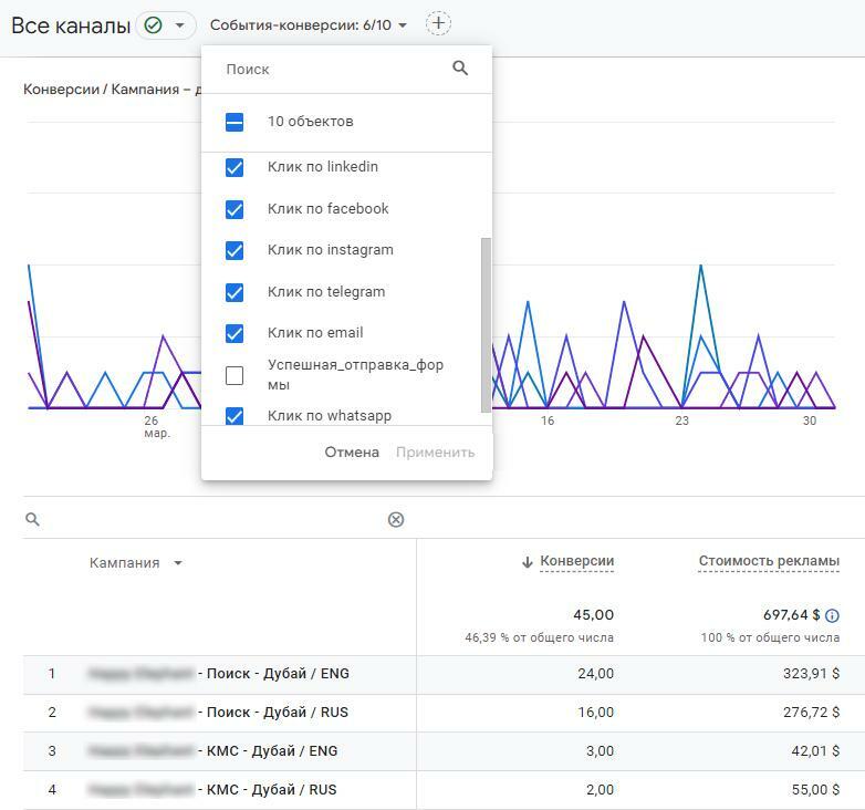 Ключевые конверсии по рекламе в Google Analytics: