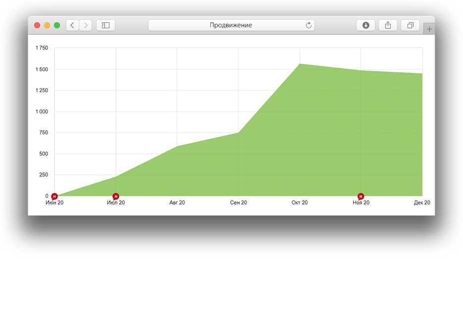 По итогам 6 месяцев работ трафик из поиска вырос с 0 до 1500 посетителей в месяц.